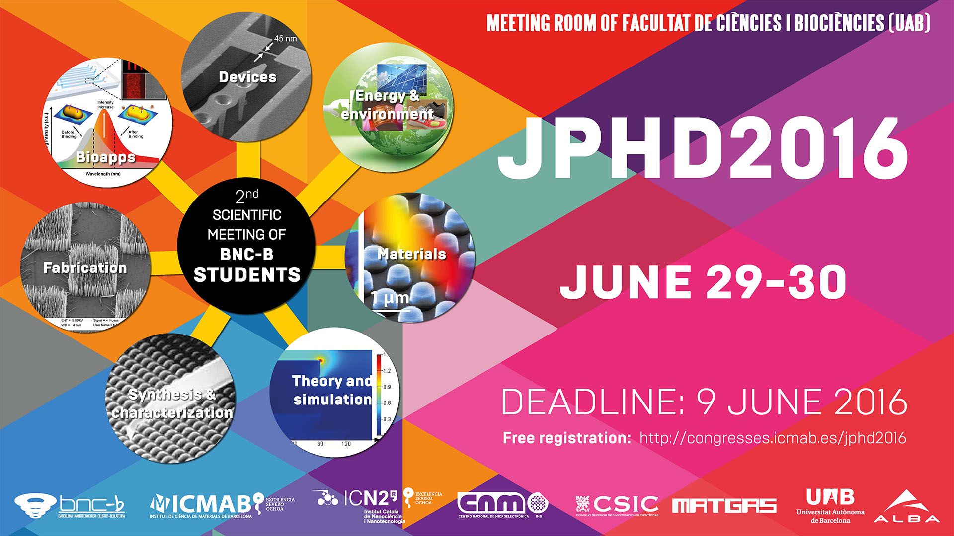 The “2nd Scientific Meeting of BNC-b Students” is aimed to present the work done by the PhD students of Barcelona Nanotechnology Cluster – Bellaterra (ICMAB, ICN2, IMB-CNM, UAB, ALBA), promoting the networking between them in an academic and scientific environment. After the successful previous editions of “1st Meeting of ICMAB students” in 2011, “1st Meeting of ICMAB-ICN-CIN2 students” in 2013 and “1st Scientific Meeting of BNC-b students” in 2015, currently we incorporate all the framework of the UAB Research Park as well as other universities as UB or UPC. Moreover, this event is also opened to master and undergraduate students, and the scientific community at large.