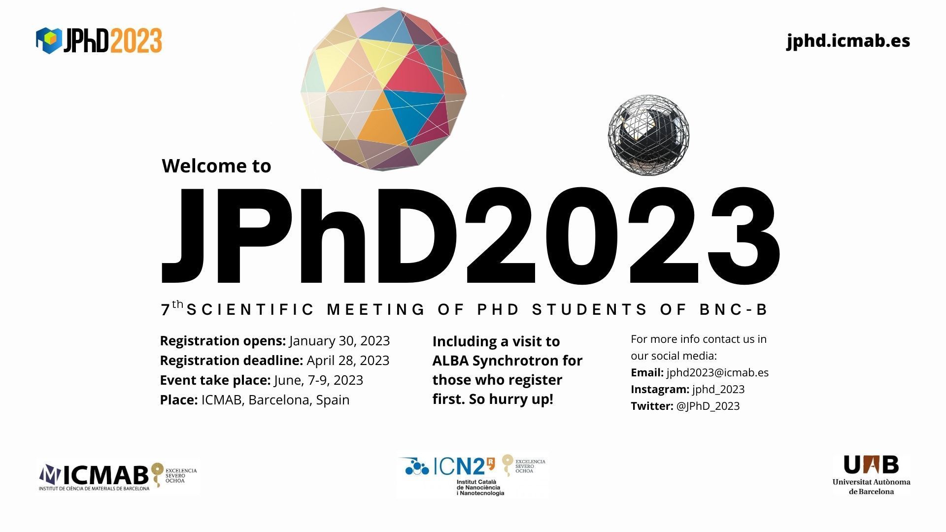 It is a great pleasure to announce the upcoming edition of this conference, the 7th scientific meeting of PhD students of BNC-b, JPhD 2023. JPhD2023 is aimed to exchange knowledge about scientific research from different fields, share research works and communicate among the PhD students of the BNC- b in an academic and scientific environment. The meeting will integrate the entire UAB research framework and open to other institutes and universities as well. The conference will be a 2-day long in person event framed with oral presentations, poster sessions, workshops, and interesting scientific plenary talks regarding current scientific issues given by established researchers in their own fields.